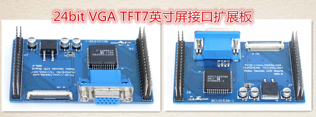 24位色VGA高清输出 TFT 7英寸LCD扩展接口板 零售价:280元 一.概述 我们根据目前视频开发应用方向,设计了这块功能完整,结构合理,资源丰富的视频开发板,这块板可以很方便的和我们目前的FPGA下载板进行直接 连接使用,您只要我们的下载板插在我们的这块板上,就可以构成一套完整视频开发应用系统.比如我们的EP1C6,EP1C12,EP2C8,EP2C35,EP3C25,4CE30 等等!我们还将推出更多功能 大设计合理的FPGA核心板.并保持与目前这块视频开发板的兼容性.所以选用我的视频采集板能够充分保证您的设计的需要,并能够根据您所研究的方向和项目的复杂程度选用不同容量的FPGA核心板. 我们提供完整的视频DA源代码和参考设计.使用这套结构可以构成完整实时视频采集和处理系统.将采集的视频信号通过我们的USB接口直接传PC进行处理.如果购买2套这样的板,可以做视频传输试验(通过USB接口).我们今后还将推出网络接口板,和大容量存储设备扩展板.这样就能充分保护您的投资,并能为您的应用范围提供更为 大的扩展的硬件保障.